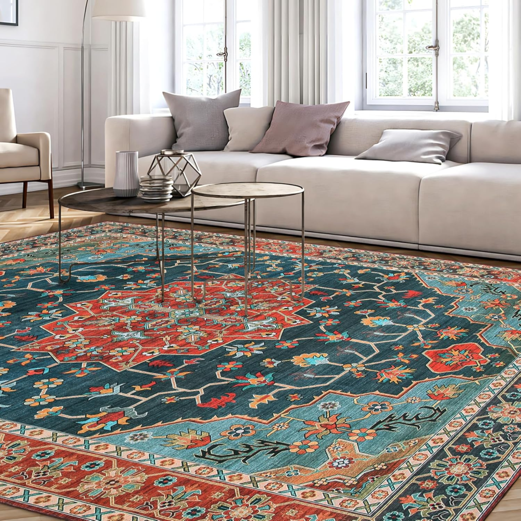 A large area rug can completely transform a space by covering outdated tiles or worn-out wood. I like rugs that are slightly bigger than the furniture arrangement—it makes the room feel intentional and cozy.