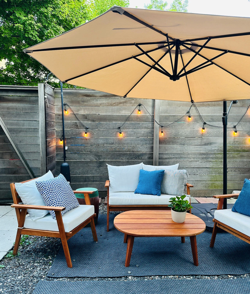 A standing umbrella paired with comfortable seating and outdoor decor creates a cozy, functional patio space—proving that you don’t need a big budget to enjoy outdoor living comfortably.