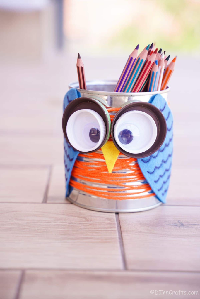 Cover an empty tin can with paper, fabric, or paint. Once dry, use it to store pens, brushes, or tools neatly. Try this Tin Can Owl Pencil Pen holder step by step on DIYncrafts.com