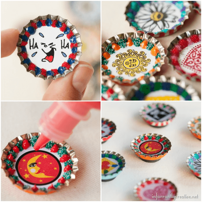 Decorate bottle caps with paint, paper, or tiny designs, then glue a magnet on the back. These make cute fridge magnets.Try This Type Of Cap Magnets On Infarrantlycreative