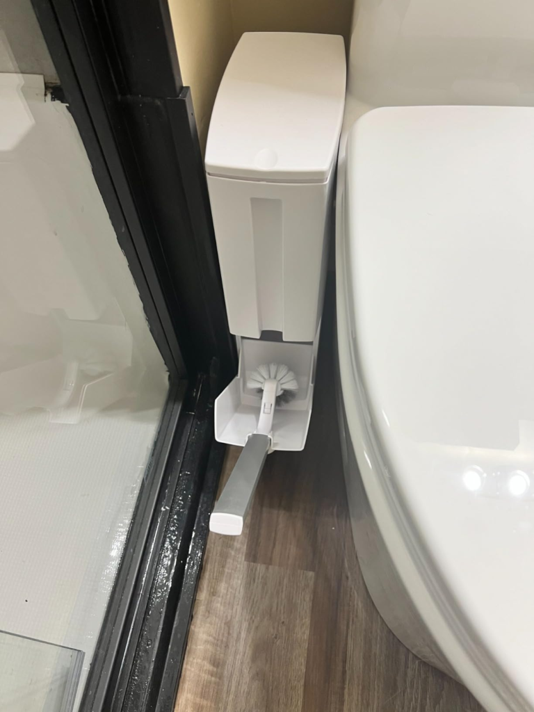 RV bathrooms are small, but smart storage can make them feel surprisingly functional.