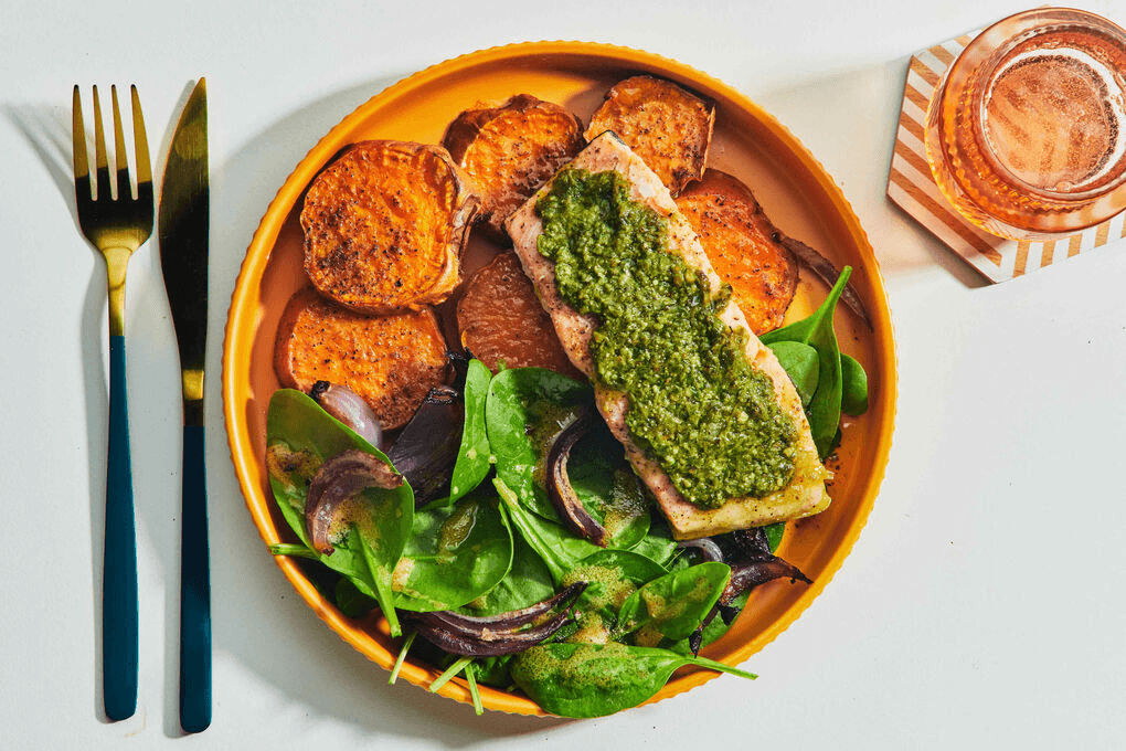 Salmon with roasted sweet potato and spinach (Dopamine Boost)