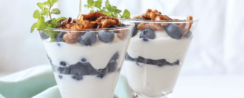 Layer in a bowl or tall glass: plain Greek yogurt, a generous handful of fresh blueberries, 8-10 walnut halves, a drizzle of raw honey, a sprinkle of granola for texture.