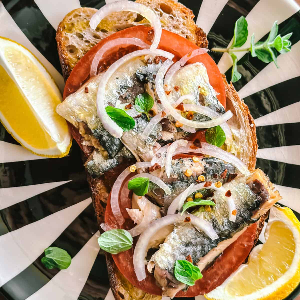 Layer smoked salmon across both halves. Add thin slices of red onion, capers, a squeeze of lemon, fresh dill if you have it, and a crack of black pepper.