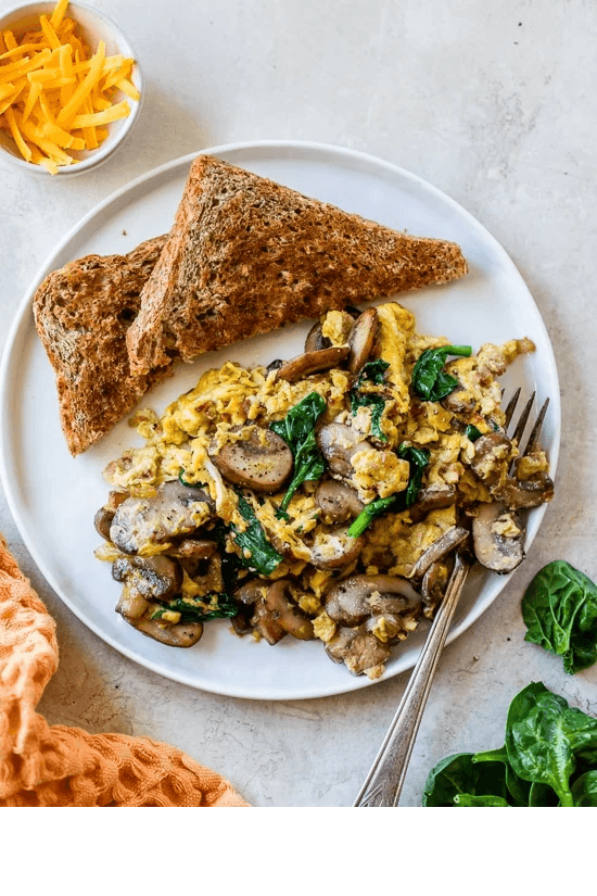 Sauté sliced cremini or portobello mushrooms in butter on medium-high until golden and reduced — about 5 minutes. Add 2 large handfuls of spinach, let wilt 1 minute.