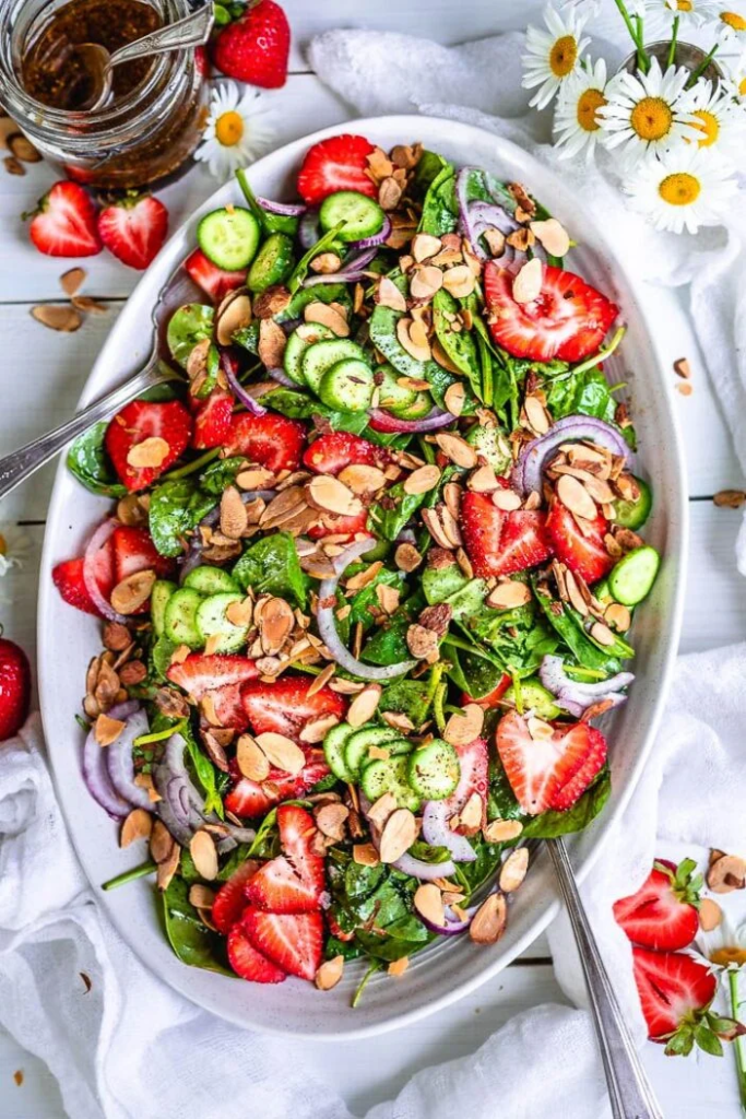 This fresh and vibrant strawberry spinach salad combines baby spinach, juicy strawberries, sliced cucumbers, red onion, and toasted almonds for the perfect mix of sweet, crunchy, and refreshing flavors.