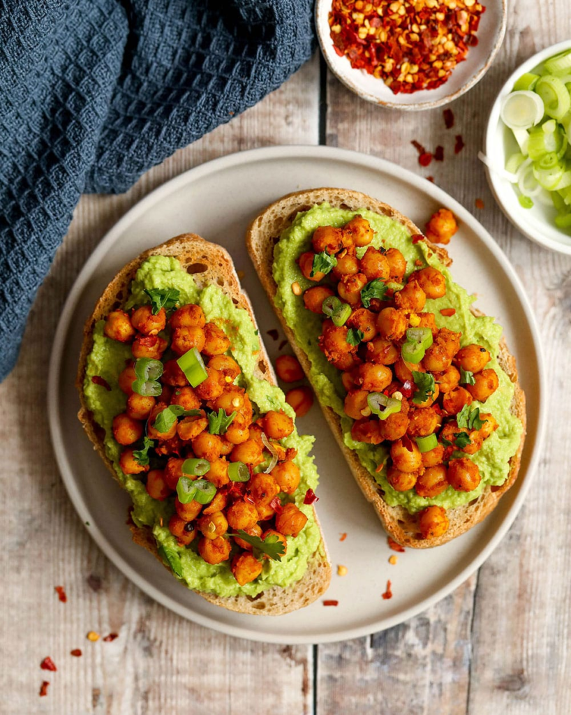 Top with the spicy chickpeas and finish with herbs or chili flakes.