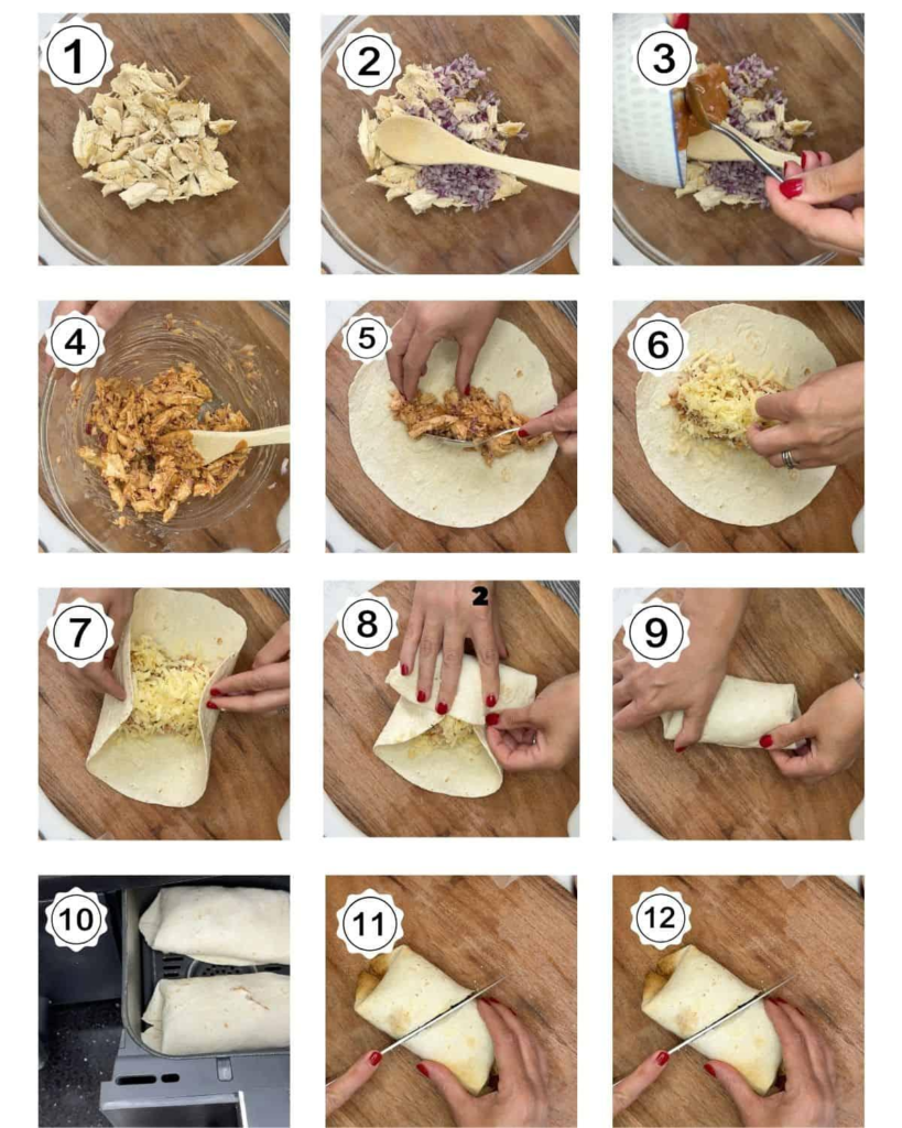 Add dressing and toss to coat.Gently mix in diced avocado for extra creaminess.Place the mixture onto a large tortilla, roll tightly (tuck ends if needed), and cut in half.