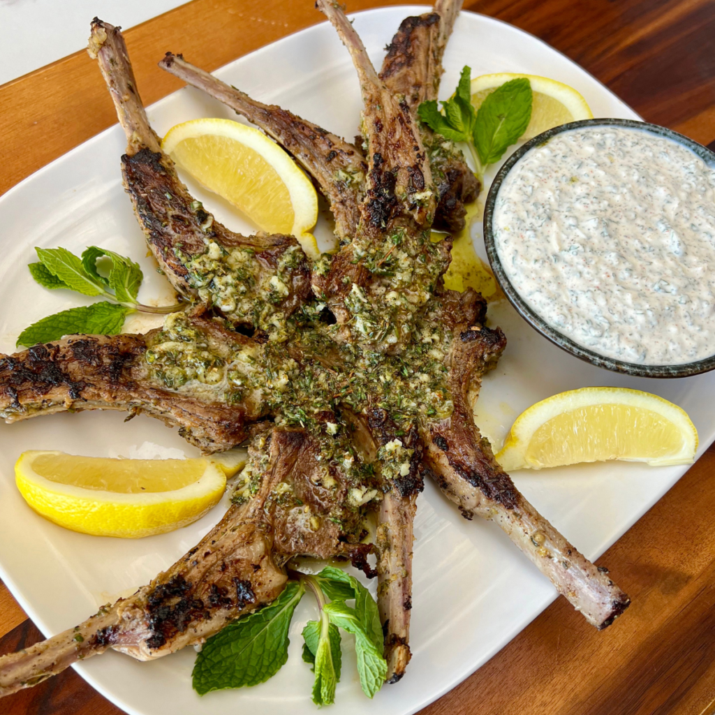 Mix Greek yogurt, mint, garlic, lemon juice, salt, and pepper, then serve it alongside the hot lamb chops.