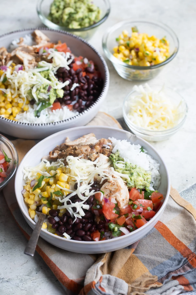 Cilantro-lime rice, seasoned black beans, grilled chicken, corn salsa, shredded cheese, and a massive scoop of guac.